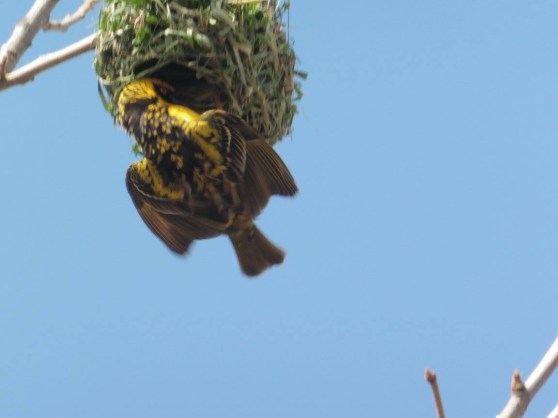 We arrived at about 10am and was greeted by an elephant just near the gate, also there was a beautiful tree with hanging birds nests – it has a pretty yellow male bird and a rather plain brown female bird – they are amazing, the male makes this intricate nest and if the female doesn’t like it she knocks it down and the male has to start again – if only we as humans could do that lol – our journey begins through this vast park – it was about 34-36 degrees so nice and warm – some roads were sealed and some were not.